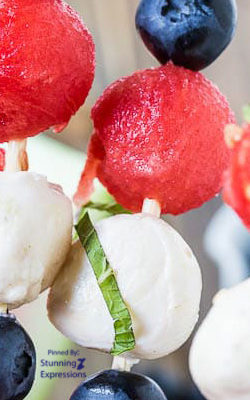 Fruit Kabobs with watermelon, blueberries, and mozzarella balls are a fun and healthy Fourth of July snack.