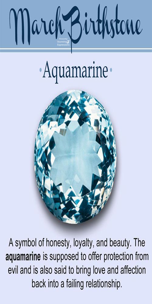 There are two birthstones for people born in March, one of them is known as Aquamarine and the other one is called blood-stone. Aquamarine as evident from the name, the name is derived from Latin language in which Aqua means water and marine means the sea.