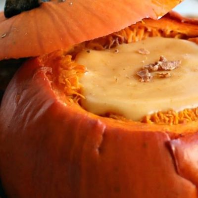 If serving inside a pumpkin, slice off the top and set aside. Scoop out the seeds and roast in a 400 degree oven for 30 – 40 minutes or until the flesh of the pumpkin is soft. Scoop out some of the cooked flesh to use in the fondue but leave enough so that the pumpkin is sturdy. If you don't have enough cooked pumpkin or if you're not using a pumpkin vessel, canned pumpkin puree is fine.