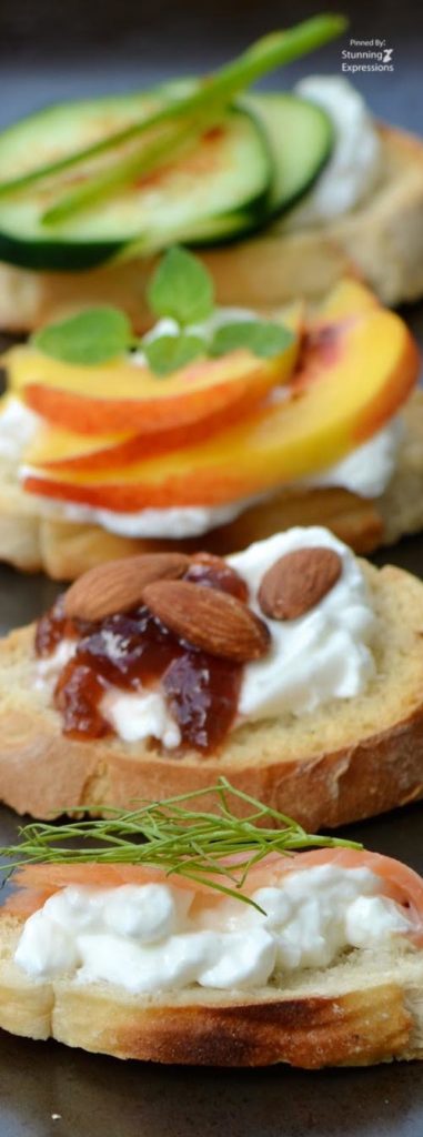 - Toast your baguette slices until golden brown. Spread your Greek yogurt or cheese on top of each piece. Top with desired ingredients. Enjoy!